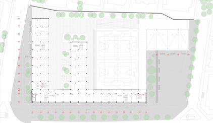 La idea principal del projecte consisteix en dividir dos grans espais exteriors, dos patis que tinguin caràcters diferents, requerits per l’ús acadèmic. Un pati de caràcter més tranquil, inspirat en un claustre universitari clàssic. L’altre pati , que contindrà les pistes d’esport, té un caràcter més esportiu i d’esbarjo.