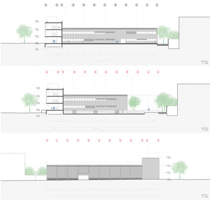 La façana principal es resolt mitjançant una gelosia de blocs de formigó armats. Aquesta gelosia aporta una lluny als espais de pas, amb els que sempre està relacionada i fa de filtre amb la Via Augusta, carrer força transitat. S’incorporen unes passarel·les que permetran realitzar un bon manteniment.